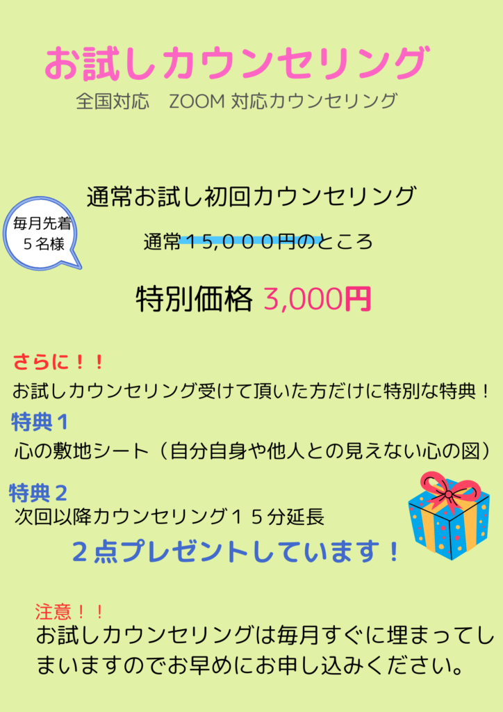 ・お悩みの解決に向けて全力でサポートさせていただきますがカウンセリングの効果には個人差があり、変化を確約するものではありませんので返金には対応していません。予めご了承の上お申し込みください。